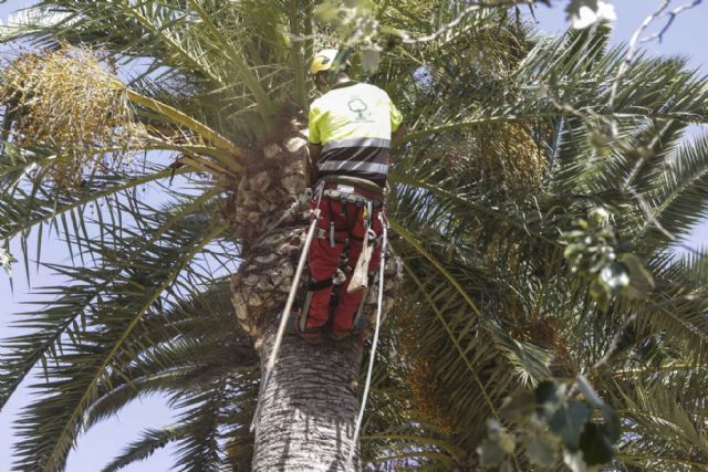 Los profesionales también están podando las palmeras y retirando de vía pública los frutos que puedan ocasionar molestias a los viandantes; actuación que se está realizando de forma exhaustiva en zonas como el Palmeral de Santiago y Zaraiche, Alquerías, La Alberca y El Palmar. En total, en el municipio existen más de 15.000 palmeras.
