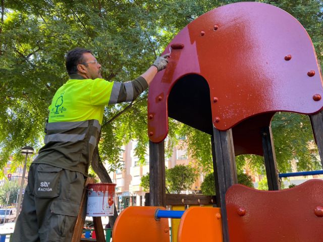 Las actuaciones consisten en la revisión de cada uno de los elementos, como lijado, pintado, limpieza y reparación, así como la reparación del caucho homologado. "Murcia apuesta por sus parques y jardines, por el medio ambiente y espacios familiares, siempre primando la seguridad y la calidad de vida de los vecinos", destaca José Guillén. Los ciudadanos pueden indicar cualquier incidencia que se produzca en un juego infantil mediante la aplicación TuMurcia.