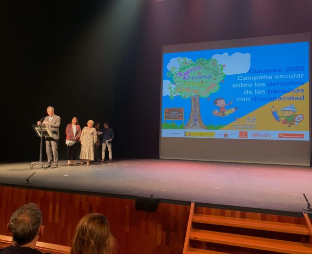 El alcalde de Murcia, José Ballesta, junto con la presidenta de FAMDIF, Carmen Gil, la concejala de Mayores, Discapacidad y Cooperación al Desarrollo, Francisca Pérez, y la consejera de Educación y Cultura, Esperanza Moreno, acudió esta mañana al acto de clausura de la Campaña de Sensibilización Escolar 19/20 que ha llevado a cabo FAMDIF/COCEMFE (Federación de Asociaciones Murcianas de Personas con Discapacidad Física y Orgánica).