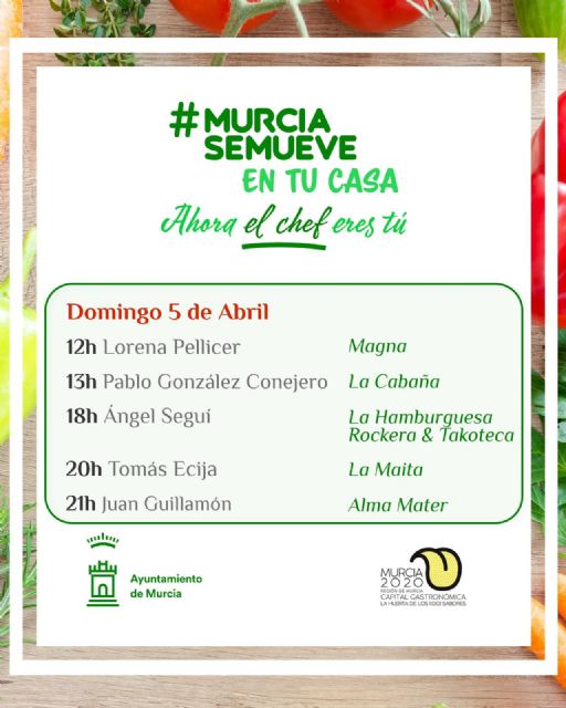 Gracias a #MurciaSeMueve ‘Ahora el Chef eres tú', que el pasado fin de semana fue seguido por más de 6.000 personas, 15 cocineros ‘entrarán' a las casa de los murcianos para enseñarles las mejores recetas a través de videos en los que se podrán descubrir sus trucos y platos más conocidos.