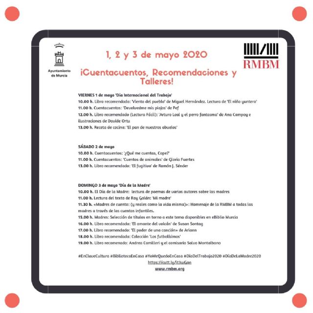 La oferta cultural para estos días se compone de una selección de 15 vídeos de diferentes temáticas, como cuentacuentos, recomendaciones literarias, un taller de cocina, así como varias lecturas especiales dedicadas a las madres, cuya figura se rinde homenaje el próximo domingo.