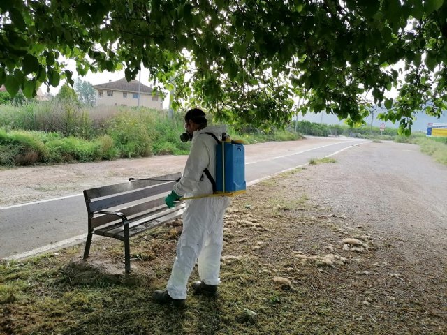 Además, de cara a seguir realizando tareas de desinfección y limpieza en todos y cada uno de los puntos del municipio, se está también desinfectando, con un producto no tóxico, el mobiliario urbano existente en el trayecto entre El Raal y La Contraparada.
