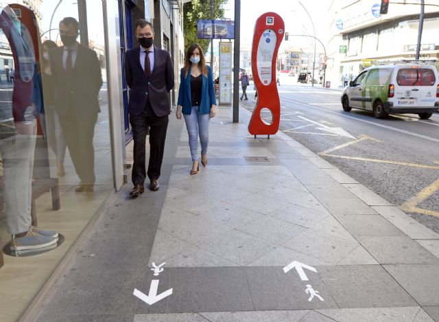 El alcalde de Murcia, José Ballesta, junto a la concejal de Movilidad Sostenible y Juventud, Rebeca Pérez, presentó esta mañana la nueva señalización para peatones de la Gran Vía Escultor Salzillo y la Avenida Constitución —dos ejes de la ciudad que suman más de 30.000 metros cuadrados—, que guía al peatón en su circulación, invitando al viandante a circular en todo momento por su derecha y promoviendo la seguridad en sus desplazamientos, así como el distanciamiento físico.