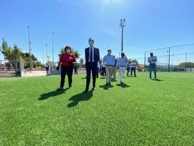 El alcalde de Murcia, José Ballesta, junto al concejal de Deportes y Salud, Felipe Coello, y el concejal de Pedanías y Barrios, Marco Antonio Fernández, supervisó esta mañana los trabajos realizados en el campo de fútbol 7 del complejo municipal deportivo de Guadalupe, ubicado en la Avenida Tierno Galván, donde se ha sustituido el antiguo césped por otro nuevo artificial homologado y de alta calidad.