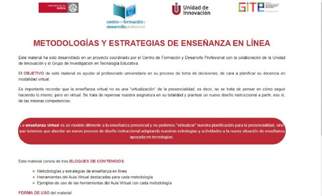 La Universidad de Murcia ha desarrollado una página web para orientar al profesorado en el uso de las diferentes metodologías de enseñanza a través del aula virtual, como parte de la apuesta por la formación e innovación en docencia semipresencial ante la previsión de que el próximo curso académico deba iniciarse con un modelo de presencialidad reducida y segura como consecuencia de la pandemia de la COVID-19.