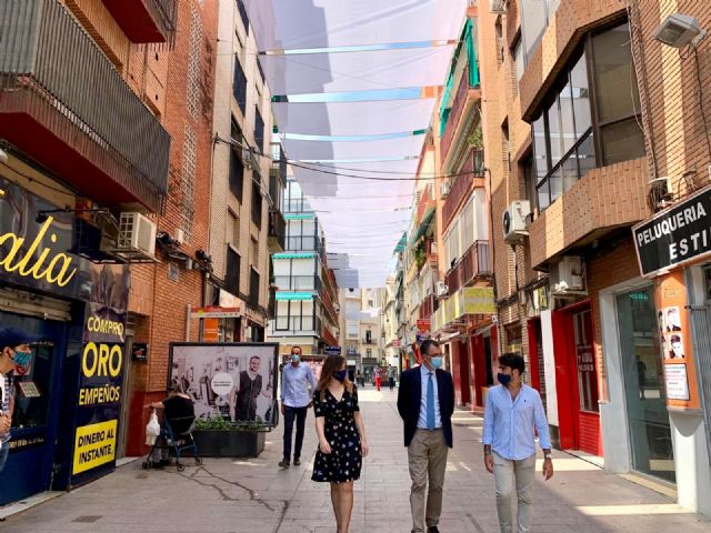 El alcalde de Murcia, José Ballesta, junto al concejal de Desarrollo Urbano y Modernización de la Administración, José Guillén, y la concejal de Movilidad Sostenible y Juventud, Rebeca Pérez, supervisó esta semana la instalación de los toldos que se han colocado por primera vez en el barrio de San Antolín, en la calle del Pilar, que protegen del sol a los viandantes y crean más espacios de sombra, minimizando los efectos de las altas temperaturas.