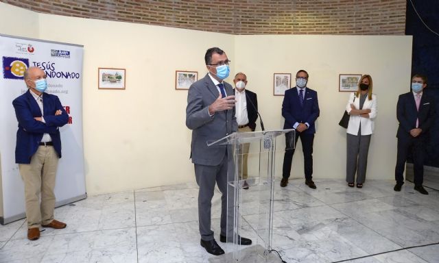 ‘Murcia Confinada’; acuarelas que muestran las calles de la ciudad durante el confinamiento, imágenes desiertas que plasman la realidad que provocó el coronavirus. El Salón de Actos de la Cámara de Comercio ha acogido hoy la presentación de esta exposición, en un acto que ha contado con la presencia del alcalde de Murcia, José Ballesta, junto al presidente de la Cámara de Comercio, Miguel López, el presidente de la Fundación Jesús Abandonado, José Moreno, y el autor de la muestra, César Oliva.