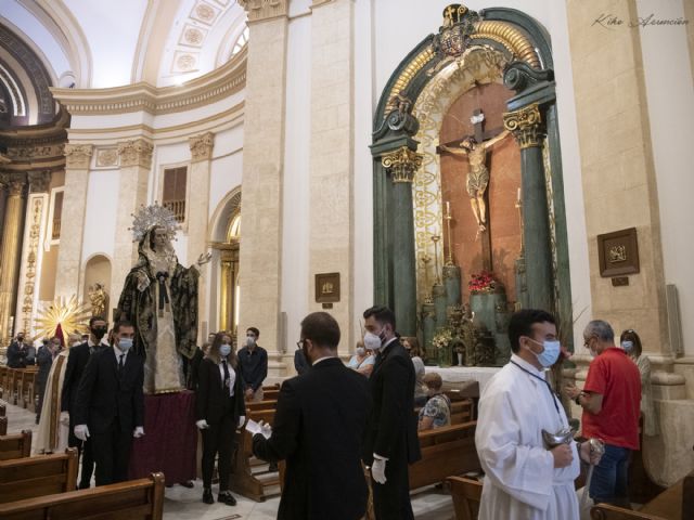 Acompañada por el canto del Stabat Mater y el volteo general de campanas, la imagen que tallara Francisco Salzillo se adentró en la capilla del Santísimo, volviendo al altar mayor con el canto de la Salve Regina, rompiendo el silencio un sentido aplauso y un emotivo: ¡Viva la Virgen de los Dolores!.
