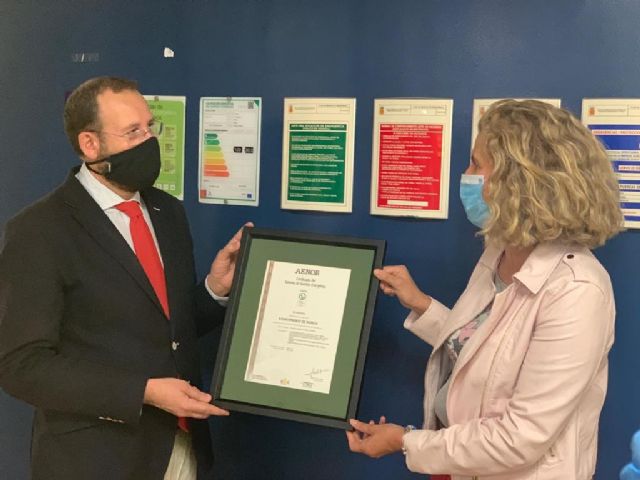 La placa de la certificación ISO 50001, con la que se reconoce la gestión de la eficiencia energética llevada a cabo por el Ayuntamiento, se encuentra en el Edificio Moneo. La concejala de Agenda Urbana y Gobierno Abierto, Mercedes Bernabé, y el concejal de Desarrollo Urbano y Modernización de la Administración, José Guillén, procedieron hace unos meses a su colocación, una iniciativa coordinada a través del Servicio de Programas Europeos, la Oficina Smart Murcia, el departamento de Ingeniería Industrial y la Agencia Local de la Energía de Murcia.