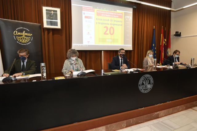 Estos datos han sido hecho públicos esta mañana en el edificio del Rectorado de la UMU en un acto en el que han participado José Luján y Beatriz Miguel Hernández, rectores de la Universidad de Murcia y la Universidad Politécnica de Cartagena; Ana Martínez Vidal, consejera de Empresa, Industria y Portavocía; José María Tortosa, presidente de AMEFMUR; Carlos Aguilera, director corporativo de Negocio de Empresas de la Comunidad Valenciana y Murcia de Bankia; y Ángel Meroño, coordinador del estudio y director de la Cátedra de Empresa Familiar Mare Nostrum UM-UPCT.
