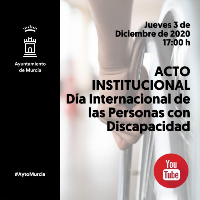 Jueves, 3 de diciembre, a las 17: horas: Acto institucional, que también se retransmitirán vía ‘streaming', en el Salón de Plenos del Ayuntamiento de Murcia y lectura del Manifiesto, que correrá a cargo de los socios de las entidades participantes, y estará centrado en los derechos de las personas con discapacidad. A continuación, se proyectará una serie de vídeos grabados previamente, protagonizados por los integrantes de las asociaciones federadas, a través de diversas formas de expresión artística, con la finalidad de transmitir a la ciudadanía mensajes de superación y de motivación. Además, durante el día 3 se iluminarán de naranja diferentes edificios emblemáticos municipales para conmemorar esta celebración internacional.