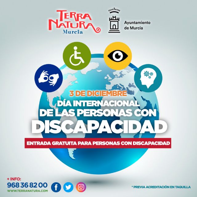 Por su parte, la Concejalía de Desarrollo Urbano y Modernización de la Administración, que dirige José Guillén, ofrece a todas las personas con discapacidad del municipio entradas gratuitas para visitar Terra Natura Murcia el jueves día 3 de diciembre.