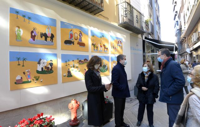 El alcalde de Murcia, José Ballesta, junto al concejal de Cultura y Recuperación del Patrimonio, Jesús Pacheco, presentó esta mañana ‘El Belén del Gaya’, que este año ha sido pintado por la artista murciana Carmen Artigas y puede contemplarse en la fachada lateral del museo, en la calle Santa Isabel, desde hoy hasta el 17 de enero.