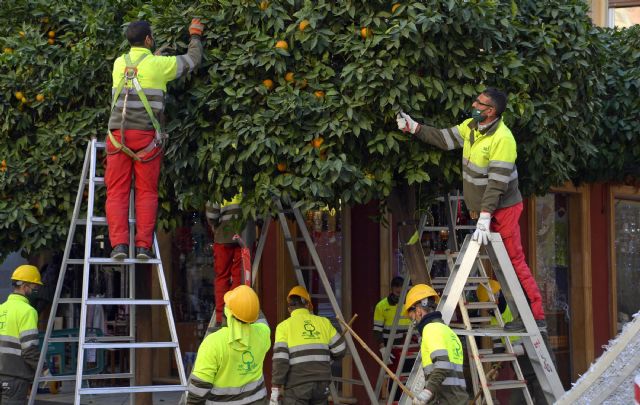 Estos trabajos se enmarcan dentro del calendario organizado del Consistorio murciano que hará que, en los próximos meses, sea podar cerca de 15.000 naranjos repartidos por todo el municipio de Murcia, y de los que se espera recoger más de 500.000 kilos de naranjas.