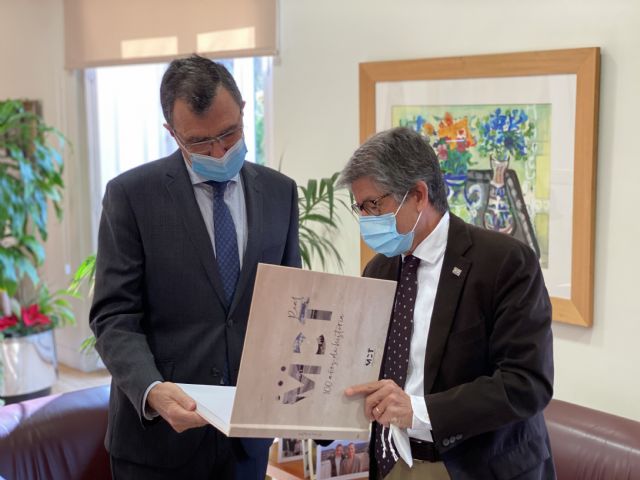 El alcalde de Murcia, José Ballesta, junto al concejal de Deportes y Salud, Felipe Coello, recibió esta mañana al presidente del Real Murcia Club de Tenis 1919, Antonio Saura, quien le hizo entrega el libro ‘Murcia Club de Tenis 1919. 100 años de historia’, que recoge los principales hitos del club a lo largo de 168 páginas con imágenes inéditas, recortes de prensa y carteles de torneos históricos, entre otros recursos.