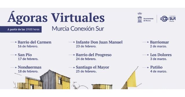 Las ágoras virtuales de Conexión Sur inician su tercera y última semana con los barrios y pedanías de Barriomar (2 de marzo) Los Dolores (3 de marzo) y Patiño (4 de marzo).