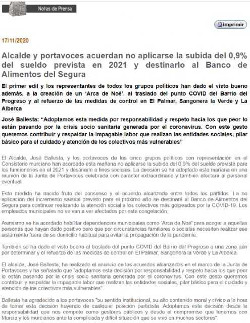 Un mes antes de la moción de censura perpetrada en marzo por PSOE y Ciudadanos, la Junta de Gobierno, que presidía el alcalde popular José Ballesta, aprobó las tablas retributivas del ejercicio 2021, en las que el PP promovió que el 0,9% que correspondía a la subida salarial de la Corporación municipal no se aplicase a este fin, sino que fuera destinada al Banco de Alimentos