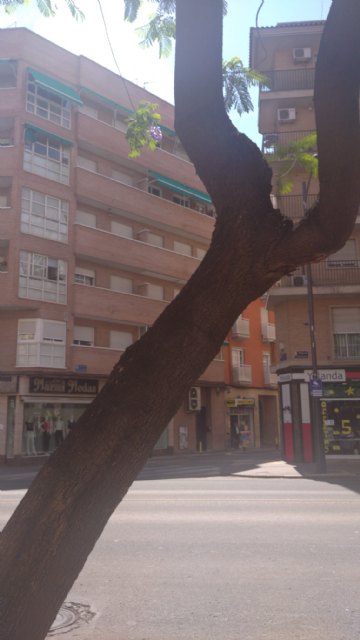 El Ayuntamiento de Murcia está retirando a lo largo del día de hoy seis jacarandas que suponen un riesgo para los ciudadanos al estar enfermas o ser peligrosas para los viandantes debido a su inclinación y consiguiente riesgo de vuelco. La Concejalía de Pedanías y Barrios, Recursos Humanos y Desarrollo Urbano, dirigida por Ainhoa Sánchez, está llevando a cabo estos trabajos a través del servicio de Parques y Jardines, que consisten también en la poda de los otros 31 ejemplares de jacarandas que hay en esta vía.