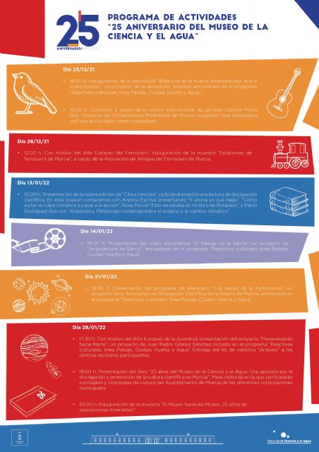 Para celebrar sus 25 años de existencia el museo ha preparado un amplio programa de actividades dedicado a todo tipo de públicos. El mismo día 23 de diciembre se organizarán dos actividades para conmemorar la efeméride. A las 18 horas tendrá lugar la inauguración y presentación de una nueva exposición, "Pajaricos de la Huerta: biodiversidad, arte e investigación", un proyecto de la asociación Arenaria encuadrado dentro del programa "Reactivos Culturales: línea Paisaje, Huerta y Agua". Además, a las 19 horas se podrá disfrutar de un concierto a cargo de la solista internacional de guitarra Carmen María Ros, docente del Conservatorio Profesional de Murcia y concertista con un gran número de premios a sus espaldas.