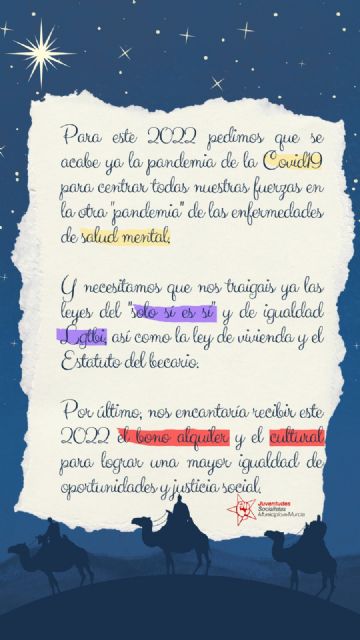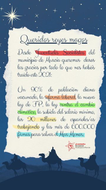 Juventudes Socialistas del Municipio de Murcia realizado su anual campaña "Carta a los Reyes Magos", con la que reivindican los logros del actual gobierno municipal y piden nuevos logros y metas para la juventud como la Ley de Vivienda y el Estatuto del Becario.