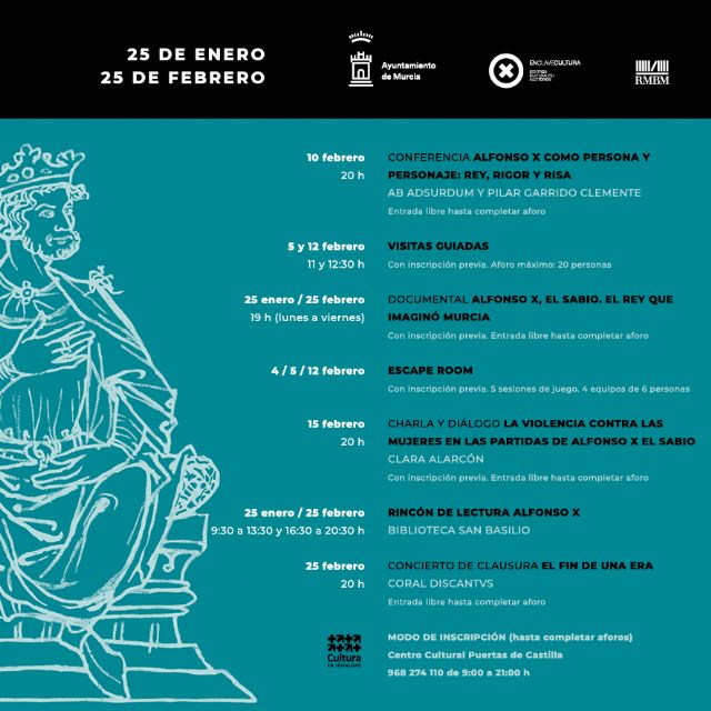 El Centro Cultural Puertas de Castilla de Murcia acoge este martes 25 de enero (19:00 horas) la inauguración de ‘La huella de Alfonso X', una exposición itinerante que podrá verse más adelante en el Centro Cultural del Carmen y en las pedanías de Cabezo de Torres y Javalí Nuevo, para finalizar en el Museo de la Ciudad. Organizada por la Concejalía de Cultura del Ayuntamiento de Murcia, consta de 20 paneles que recorren aspectos de la vida y obra del Rey Sabio. Se trata además de una muestra divulgativa, acompañada de una agenda de actos complementarios con conferencias, visitas guiadas y ‘scape room'. Además, se ha editado para la ocasión un breviario que resume la información que se ofrece al visitante.
