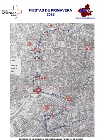 El servicio de Protección Civil del Ayuntamiento de Murcia dispone de 5 ambulancias con su correspondiente personal. Durante el desfile 5 parejas adscritas al hospital de la Plaza Cruz Roja que, junto a otros voluntarios, durante el desfile se dispondrán a lo largo del recorrido, ubicados en las proximidades de las salidas de emergencia.