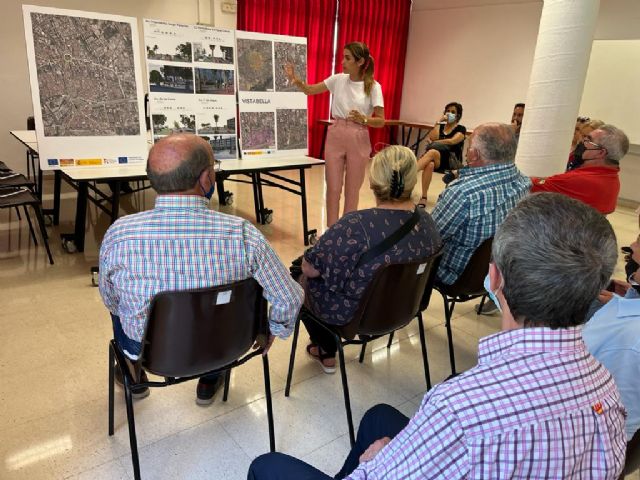 La concejala de Movilidad Sostenible y Limpieza, Carmen Fructuoso, acompañada de técnicos municipales, ha mantenido un encuentro con vecinos y colectivos de Vistabella para explicarles las distintas actuaciones que se desarrollarán en este barrio gracias a los proyectos de movilidad del Equipo de Gobierno del Alcalde Serrano.