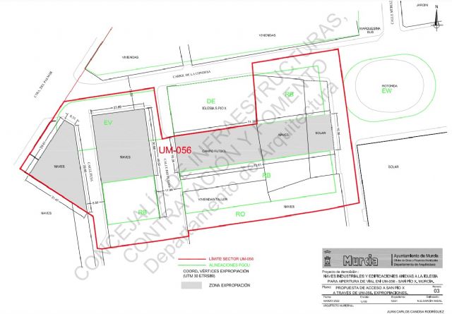 La Junta de Gobierno del Ayuntamiento de Murcia ha aprobado las obras de demolición de las naves industriales y edificaciones anexas a la iglesia de San Pio X. Estas actuaciones, van a permitir la construcción de un nuevo vial que va a conectar la carretera de el Palmar con este barrio murciano.