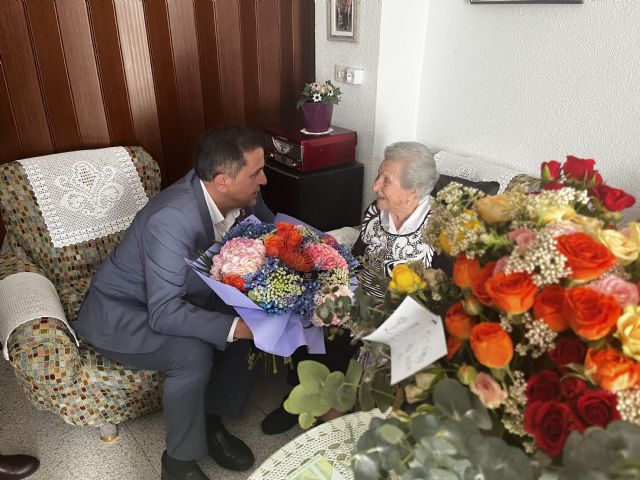 José Antonio Serrano, acompañado por los concejales Andrés Guerrero y Esther Nevado, ha visitado esta tarde a Concepción Lax para felicitarla en nombre de todos los murcianos y entregarle un ramo de flores