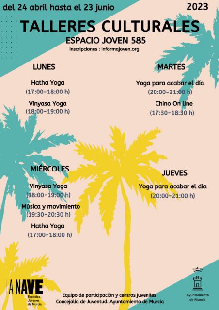 Los espacios jóvenes municipales regresan con una extensa programación para los meses de abril, mayo y junio. Los jóvenes de 12 a 30 años residentes en el municipio podrán disfrutar de cerca de 50 actividades semanales, repartidas entre los espacios La Nave, El Palmar y el 585.