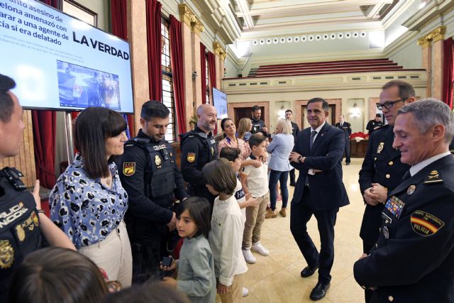 El Alcalde José Antonio Serrano ha recibido esta mañana, en el Salón de Plenos del Ayuntamiento de Murcia, a la Unidad de la Policía Nacional que detuvo, el pasado 9 de abril en la estación del Carmen, al sospechoso de un asesinato que huía desde Barcelona, habiendo raptado durante su escapada a dos mujeres. En el momento de la detención, el sospechoso iba armado con una pistola, un revólver y numerosa munición.