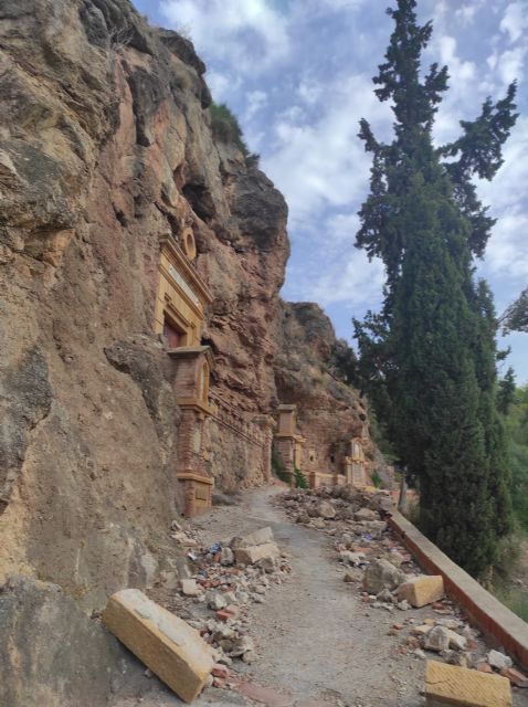La Fuente Santa de la Virgen se encuentra a escasos metros bajo la Cueva de la Cómica, cuyos derrumbes sufridos hace unas semanas también fueron denunciados por Huermur ante la Dirección General de Patrimonio Cultural, sin que hasta la fecha hayan tenido solución.