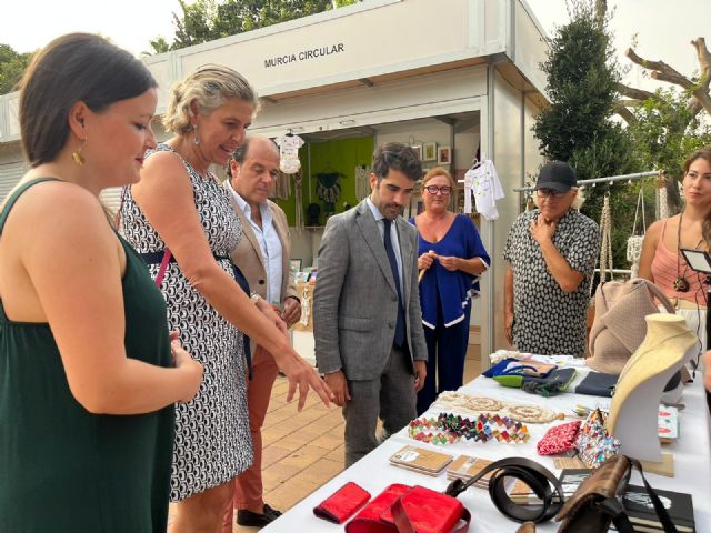 La concejal de Gobierno Abierto, Promoción Económica y Empleo, Mercedes Bernabé, y el edil de Cultura e Identidad, Diego Avilés, inauguran el stand Murcia Circular, con el que se pretende dar visibilidad a las creaciones que estos empresarios murcianos desarrollan en un local del Ayuntamiento en la Plaza Circular