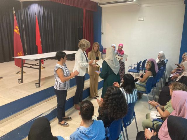 La concejal de Gobierno Abierto, Promoción Económica y Empleo, Mercedes Bernabé, ha entregado este martes junto a la edil de Bienestar Social, Familia y Salud, Pilar Torres, y la presidenta de la Junta Municipal de Torreagüera, Silvia Almarcha, los diplomas a las alumnas que han finalizado los cursos de ‘Costura: Arreglos y adaptaciones de prendas de vestir y patronaje, nivel iniciación' y ‘Español para personas extranjeras, nivel básico', impartidos por el Servicio Municipal de Empleo del Ayuntamiento de Murcia, en colaboración con el de Servicios Sociales. Estas acciones formativas se han llevado a cabo en el Centro Cultural de Torreagüera.
