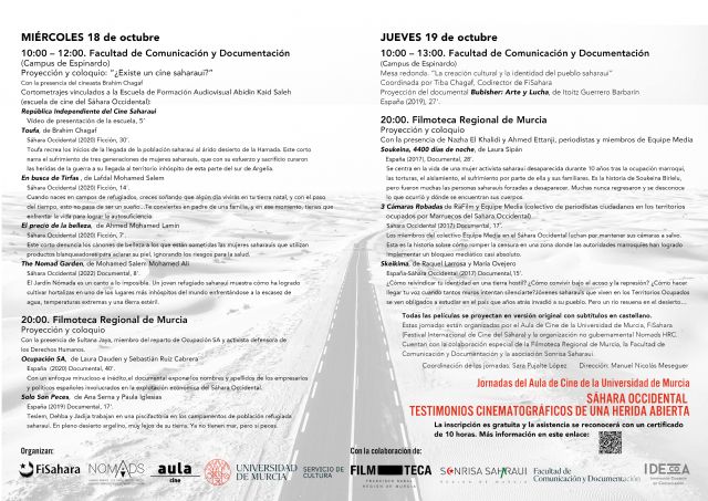 El Aula de Cine de la Universidad de Murcia, con la colaboración de FiSahara (Festival Internacional de Cine del Sáhara), la ONG Nomads HRC y Sonrisa Saharaui, ha organizado las jornadas 'Sáhara Occidental. Testimonios Cinematográficos de una herida abierta', que se celebrarán mañana, miércoles 18 de octubre, y el jueves 19 en la Facultad de Comunicación y Documentación y la Filmoteca Regional. La programación incluye una muestra de producciones cinematográficas saharauis y españolas que han abordado las consecuencias de la herida histórica que sigue abierta en el pueblo saharaui.