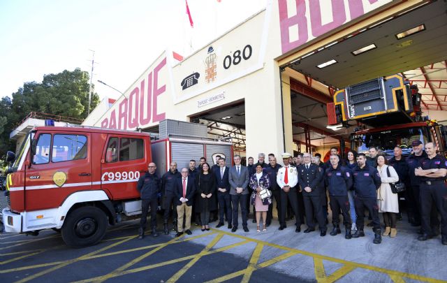 El alcalde de Murcia, José Ballesta, acompañado por el concejal de Seguridad Ciudadana y Emergencias, Fulgencio Perona; la concejal de Talento Joven y Espacios Públicos, Sofía López-Briones; y el jefe del Servicio de Extinción de Incendios de Murcia, Pedro Guirao, ha hecho entrega, esta mañana, de dos camiones de bomberos a la alcaldesa de la ciudad africana de Mariental, Cherien Aletha Kock, beneficiaria de la donación.