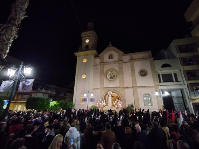 Al regio paso del Cristo de las Penas, sumido en el tronar de los tambores, siguió el célebre Santo Sepulcro beniajanense, en el que yace el Señor de la Buena Muerte que tallara el escultor local José Ortiz. Después, San Juan Evangelista con sus penitentes de encendidas capas rojas. Y cerrando, como reina del Viernes Santo, Ntra. Sra. de la Soledad envuelta por las marchas interpretadas por la Agrupación Musical de Beniaján. La tregua otorgada por la lluvia de estos días se tornó en copiosa petalada, precisamente, sobre el trono de la Virgen a su paso por las llamadas Cuatro Esquinas. Emoción a flor de piel.