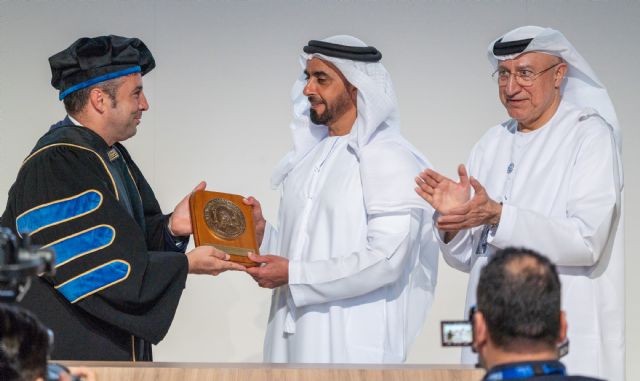 Uno de los momentos más emotivos del acto llegó cuando José Luis Mendoza entregó a Saif bin Zayed Al Nahyan, en reconocimiento a su apoyo y contribución al programa, una metopa de la UCAM y un diploma que le acredita como Catedrático Extraordinario en Acción Humanitaria Sostenible.
