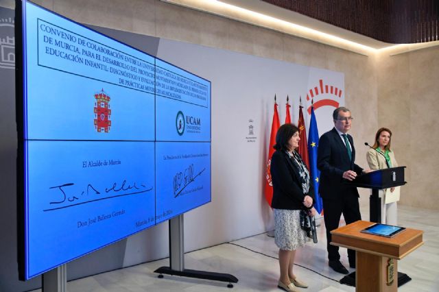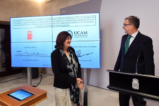 El alcalde de Murcia, José Ballesta, acompañado por la concejal de Educación y Atención a la Ciudadanía, Belén López, y la presidenta de la Universidad Católica San Antonio de Murcia (UCAM), María Dolores García, han firmado un convenio de colaboración para la implementación de un programa de prácticas motrices musicalizadas en las Escuelas Infantiles Municipales.