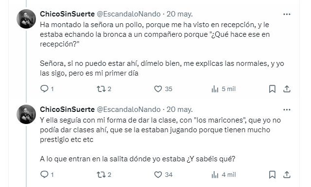 Fernando tenía que dar dos clases ese día, una a las 19:00 horas y otra a las 21:00 horas, con una hora de diferencia entre clase y clase. Justo en esa hora, Fernando decidió marcharse del centro, tal y como ha denunciado públicamente en su perfil de X debido a un episodio homófobo. Nos hemos puesto en contacto con él para saber qué sucedió exactamente para que tuviera que despedirse de su puesto de trabajo.