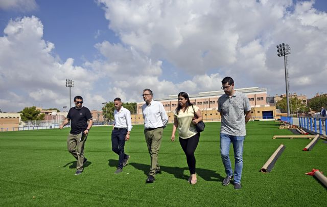 El alcalde de Murcia ha realizado una visita técnica a los trabajos que se están realizando en la pedanía, que han consistido en la sustitución del césped artificial, la colocación de nuevas porterías, así como la instalación de protectores de barandillas, entre otras actuaciones