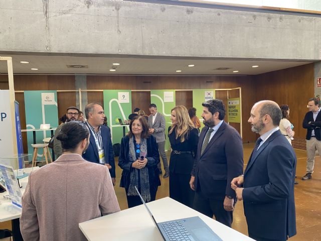 Fernando López Miras, presidente de la Comunidad Autónoma de la Región de Murcia, ha visitado los stands de las startups presentes en el evento acompañado por María Dolores García, presidenta de la Universidad Católica de Murcia; María Isabel López, consejera de Empresa, Empleo y Economía Social, y Joaquín Gómez, director del INFO.