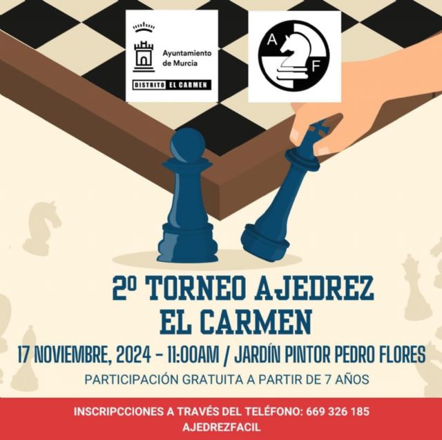La Junta Municipal del barrio de El Carmen ha organizado la segunda edición del Torneo de Ajedrez, gracias al éxito de la primera convocatoria donde, tanto niños como adultos, se reunieron frente a un tablero con el objeto de disfrutar de una jornada en familia además de transmitir a los más pequeños los valores esenciales de este juego como son el respeto, la honestidad, responsabilidad y la perseverancia.