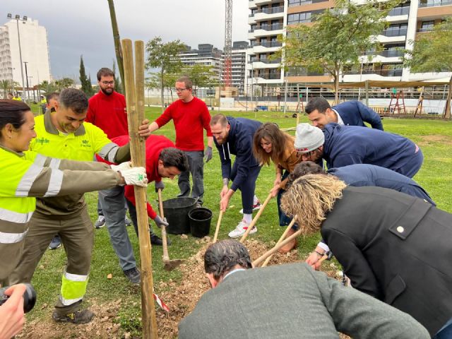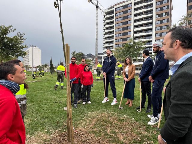 Este año, en el jardín ubicado en la avenida Río Madera de la pedanía de Churra, se ha procedido a la plantación de más de medio centenar de árboles con el objetivo de compensar la huella de carbono generada por la emisión de carnés de plástico reciclado emitidos para los socios del UCAM C.B, que optaron seguir usando este soporte para su carné durante esta temporada depositando para su uso tres euros.