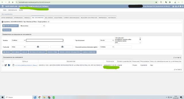 Es exactamente a las 11:41 h. del día de ayer, el minuto exacto en el que VOX registra la propuesta para el próximo pleno del día 27 de marzo del ayuntamiento de Murcia, titulada "MOCIÓN SOBRE RESTAURACIÓN DE LA URNA SEPULCRAL DEL REY ALFONSO X" entre otras mociones.