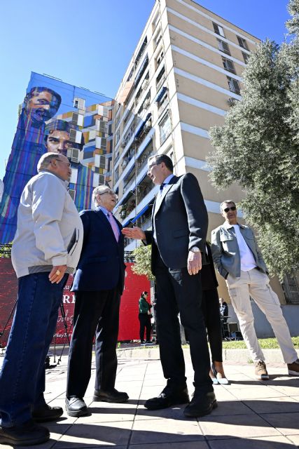El Alcalde de Murcia ha presentado la obra 'El Relevo', de Carlos Callizo, que abarca una superficie de 400 metros cuadrados y se ubica en la fachada norte del edificio, compartiendo protagonismo con la emblemática 'Cara de la Paz'