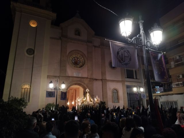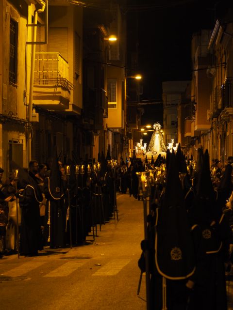 Siguiendo los pasos del apóstol, aparecieron las túnicas enlutadas de la nutrida Hermandad de la Soledad. Hay algo magnético en esta procesión y especialmente en esa Virgen dieciochesca que recoge entre sus manos tres clavos de dolor y las oraciones de tantas y tantas personas, que también se clavan en ella a través de las miradas. A sus pies, junto a la corona de espinas, asomaban este año entre los claveles cinco flores de la pasión, por las Cinco Llagas, presagio también de la eclosión de la Pascua Florida: simbolismo y cuidado en cada detalle. Igualmente fueron flores, en este caso pétalos de rosas blancas, las que cayeron sobre su trono desde algunos balcones del itinerario, rompiendo en aplausos la concurrencia.
