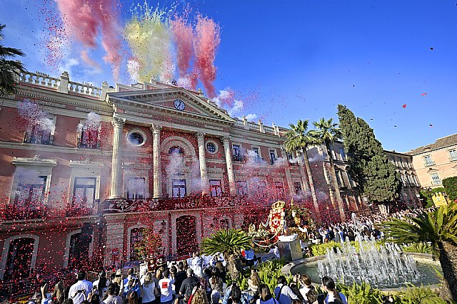 El punto culminante del día ha tenido lugar por la tarde con la celebración del desfile por la fachada del Ayuntamiento. De esta forma, y en más de una treintena de ubicaciones por la ciudad, se han lanzado pétalos de flores, serpentinas y confeti, en la que ha participado carrozas alegóricas a los festejos tradicionales de nuestras fiestas, así como otros temas, todas ellas decoradas con flores naturales teniendo como objeto exaltar la incomparable primavera murciana. Al finalizar cada uno de los asistentes ha podido llevarse una parte de esta jornada, ya que a su fin se han repartido en la plaza de Camachos las flores que adornaban las carrozas. El momento más emotivo ha llegado con la interpretación del Himno a Murcia por parte del Orfeón Fernández Caballero y la Orquesta de Jóvenes Ciudad de Murcia, en una exaltación de los valores que definen a nuestra tierra frente a la puerta de la Casa Consistorial.