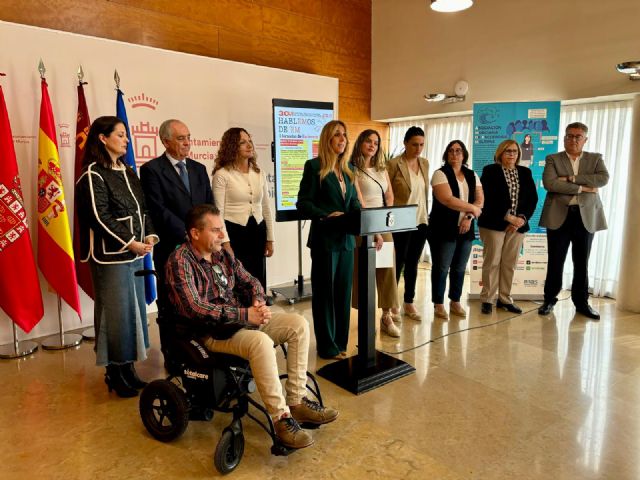 Las concejalas de Mujer, Políticas de Conciliación, Mayores y Discapacidad, Ascensión Carreño, y de Bienestar Social, Familia y Salud, Pilar Torres, han presentado la programación, junto al Director general de Planificación, Farmacia e Investigación Sanitaria, Jesús Cañavate; María Antonia Abril, Directora General de Pensiones, Valoración y Proyectos de inclusión del Instituto Murciano de Acción Social; la presidenta de AMDEM, Paqui Meroño; la responsable de comunicación de AMDEM, Lorena Hernández; y Sara Miras, fisioterapeuta en AMDEM y una de los ponentes de las jornadas, así como otros miembros de la corporación municipal.