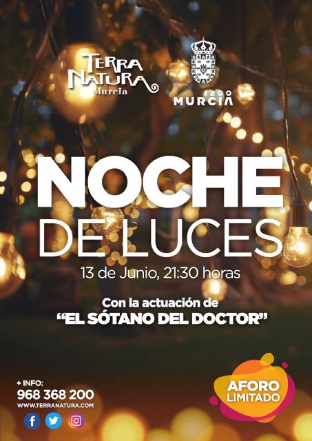 La tradicional Noche de las Velas del parque zoológico municipal Terra Natura Murcia se renueva este año para convertirse en la Noche de las Luces, que tendrá lugar mañana, 13 de junio, a partir de las 21:30 horas. En esta edición del ya emblemático evento gastronómico y musical, el parque se iluminará no solo con cirios, sino también con figuras retroiluminadas, guirnaldas LED, focos y otros efectos visuales.